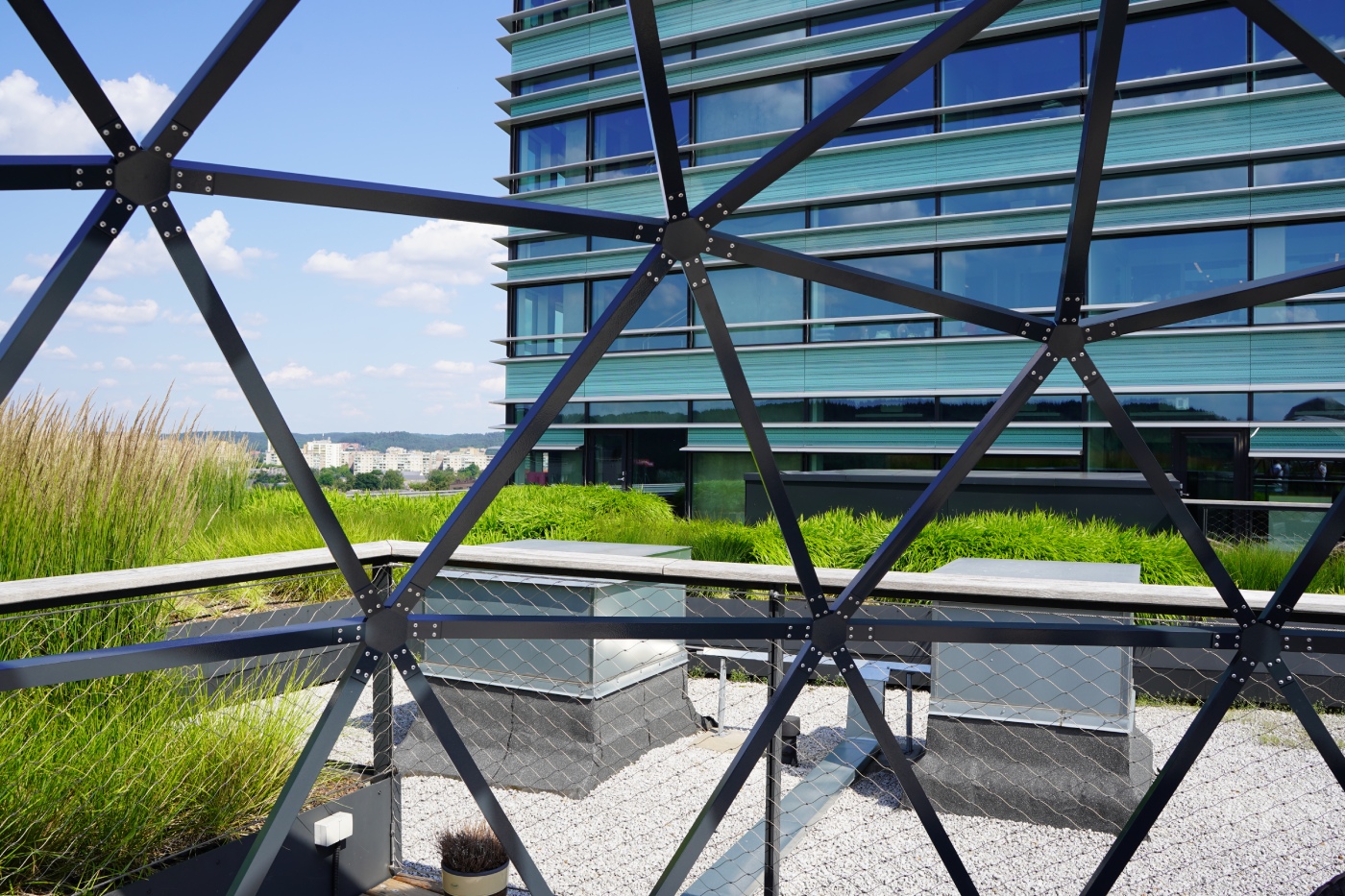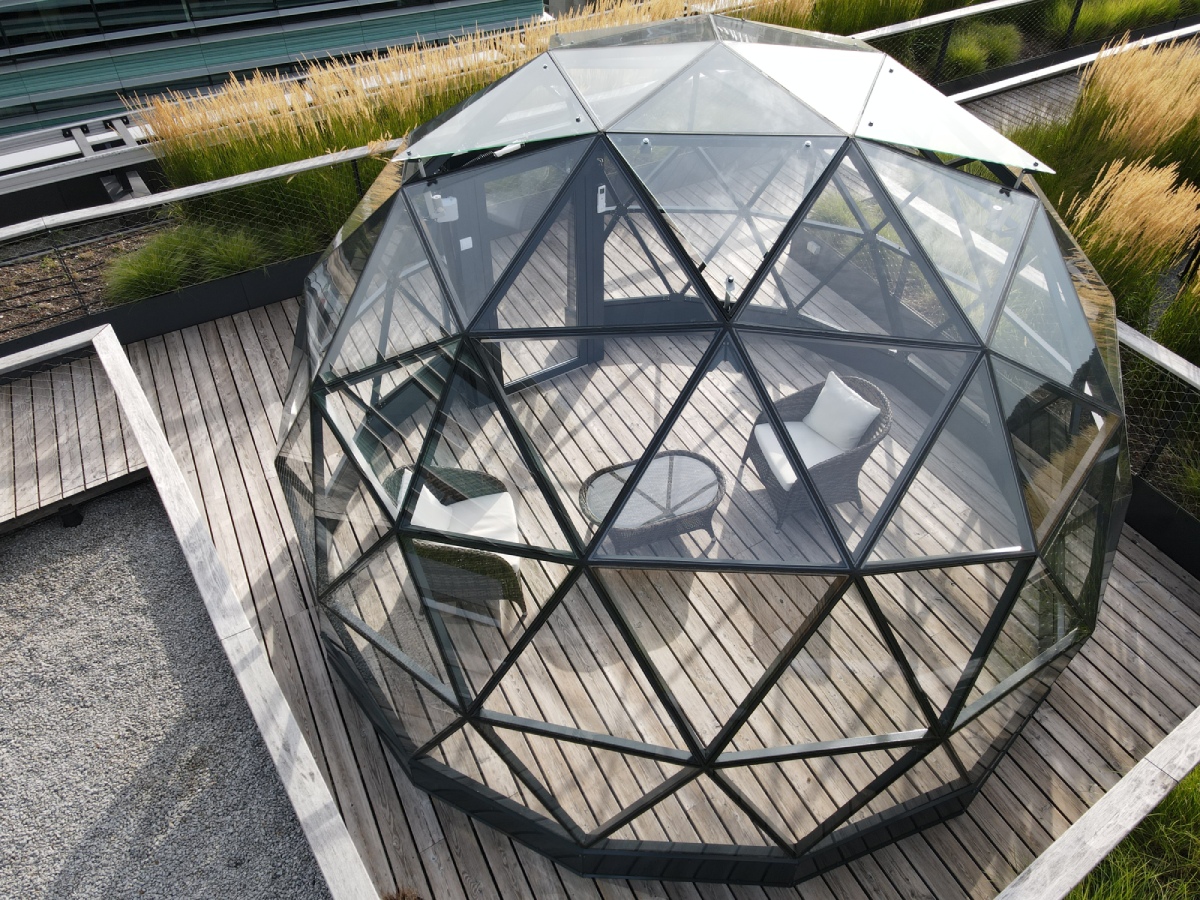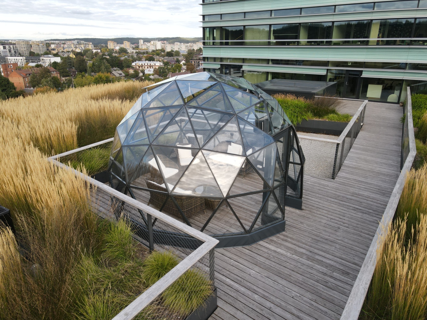 A modern recreation and event area for employees to take a break from the day’s work and get inspired by the surrounding city views from the roof, with 360-degree views. The dome is made of an aluminum profile with a tempered glass facade. It is perfect not only for relaxation, but also for events or exhibitions.